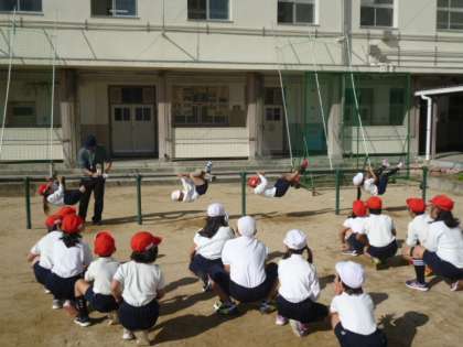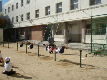 今日は鉄棒をしています。いろいろな技をしました。豚の丸焼きをやっています。できた人に拍手をするなど、ほんわかした雰囲気でした!