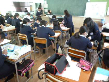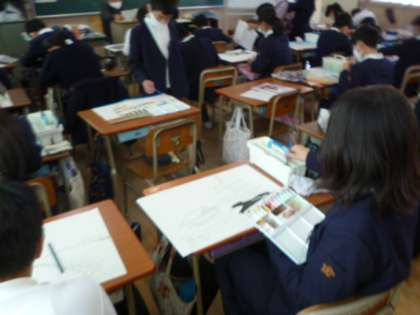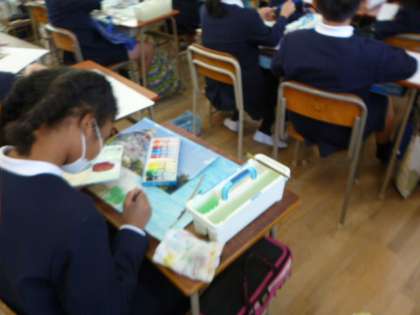 世界の有名な建築物や身近な学校などを写真を参考にして、描いています。完成が楽しみです。