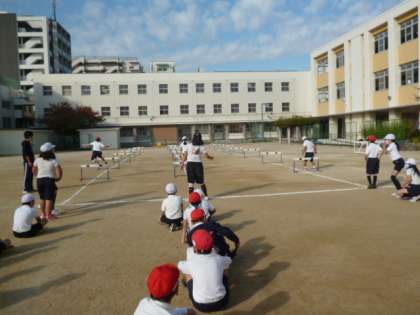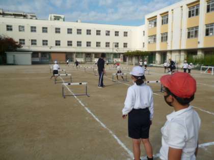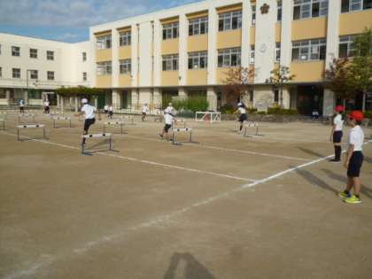 今日は4年生がハードル走をしています。同じ足でハードルを跳び越すことを目標としています。なかなか難しい!