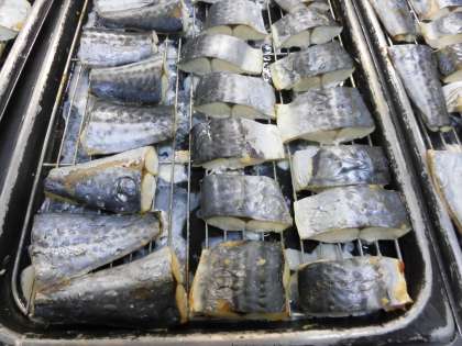 「さごしのおろしじょうゆかけ」は、塩で下味をつけて焼いたさごしに、だいこんおろしの入ったタレをかけた、ご飯に合うおかずです。さごしはさわらの子どもです。