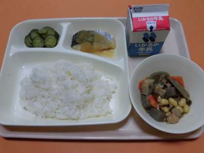 ★さごしのおろしじょうゆかけ・大豆と冬野菜の煮もの・きゅうりのしょうがづけ・ご飯・牛乳