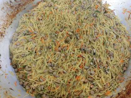 「ウインナーときのこのしょうゆ風味スパゲッティ」は、オリーブ油でにんにくを香りよくいため、ウインナー、ベーコンを主材に、季節のしめじ、しいたけ の他、たまねぎ、にんじん、ピーマンを使用し、しょうゆ ベースの和風の味つけにしてい ます。 配食時にきざみのりをふりかけて食べます。