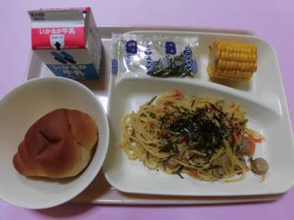 ★ウインナーときのこのしょうゆ風味スパゲッティ・焼きとうもろこし・黒糖パン(小)・牛乳