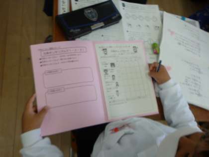 連絡帳を書いています。宿題には、今日から始まる「元気モリモリ週間」の目標の一つである「はやねはやおき」が入っていました。元気モリモリファイルにも記録していくので、しっかりと取り組んでいきましょうね。