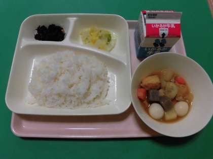 「関東煮」は、鶏肉、うずら卵、新食品のごぼう平天を主材に、じゃがいも、こんにゃく、あつあげ、だいこん、にんじんを使用しています。【うずら卵】の食物アレルギー個別対応献立です。どの素材もよく味がしみておいしかったです。