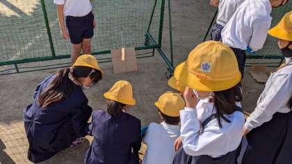 運動場で鏡を使った実験をしています。鏡なしと一枚反射させた時、三枚反射させた時の温度の違いを調べました。温度がかなり変わったので、驚いていました!