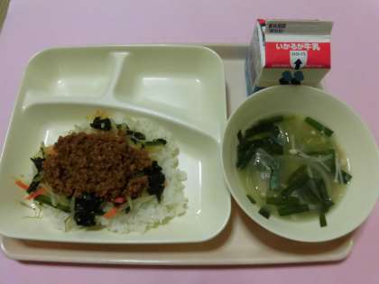 生徒が考えた【献立のねらい】は、「栄養を考えて、野菜を多く使い、見ためでも食欲がわくようにみんなが好きなカレーを、韓国・朝鮮料理と少しアレンジして『ドライカレービビンバ』を考えました。また、いろいろな国の食について考えるきっかけになってほしいと思っています。」 とのことです 。