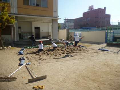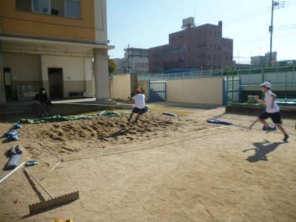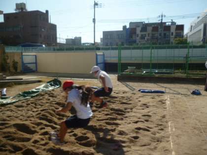 幅跳びのフォームを練習しています。手を振り上げて、空中のフォームを確認しています。