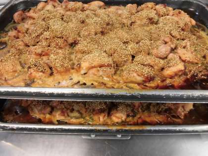「鶏肉のごまだれ焼き」は、ねりごまを使用した調味液で下味をつけた鶏肉に、たまねぎ、ピーマンを混ぜ合わせ、いりごまをふり、焼き物機で焼きます。 ごまの風味をきかせた仕上がりになっています。
