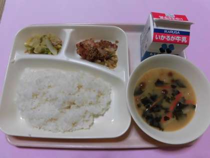 ★鶏肉のごまだれ焼き・なめこのみそ汁・キャベツのいためもの・ご飯・牛乳