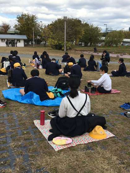 いつもとは違って、距離をとってのお弁当。もっとワイワイ言いながら食べたいけど、今は我慢!