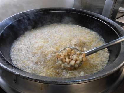「さけのマリネ」は、塩、こしょうで下味をつけ、でん粉まぶしてなたね油であげたさけに、たまねぎの入ったマリネ液をからませます。