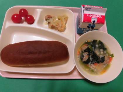 ★さけのマリネ・肉だんごと麦のスープ・プチトマト・黒糖パン・牛乳