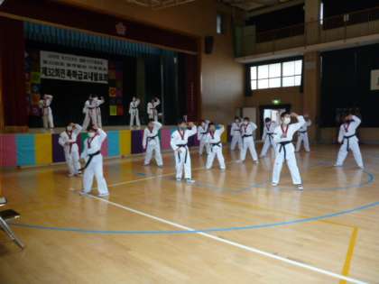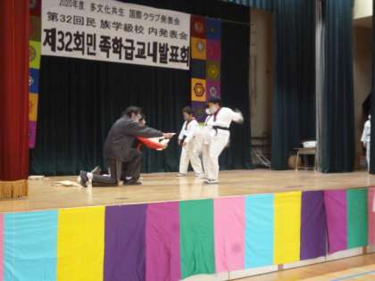 「テクォンド」を披露しました。みんなかけ声がとても大きく、迫力のある演技でした。演技の後は、一人ずつ板割りに挑戦していきました。全員、見事に割ることができました!