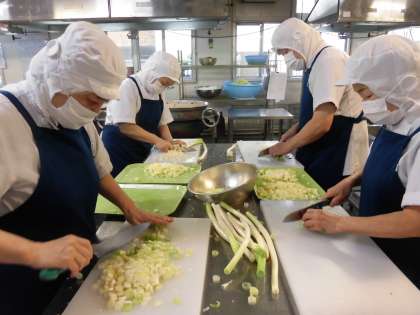 「すまし汁」は、鶏肉、はくさい、たまねぎ、にんじん、えのきたけ、青みにみつばを使用しています。美味しいだしで、心を込めて調理しています。