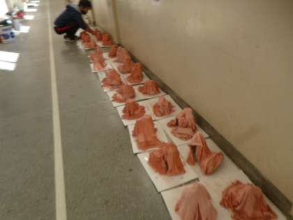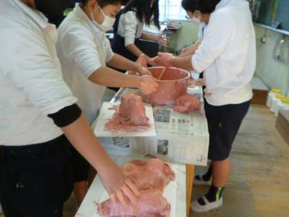 水粘土を使って、作品展の作品を作っています。(制服が汚れて大変そうな人もいました。)地球をイメージしているそうです。廊下には出来上がった作品がずらりと並べてありました。