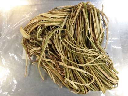 「豚肉と干しずいきのみそ煮」は、豚肉、干しずいき、うすあげ、青ねぎを使用し、砂糖、みりん、こいくちしょうゆ、赤みそで味つけした煮ものです。1枚目の写真は干しずいきです。ずいきはさといもの葉柄のことで、カルシウムや鉄、食物せんいが多く含まれます。日本で昔から食べられてきた乾物のひとつとして、児童生徒に伝えていきたい食材です。