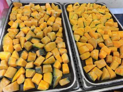 「焼きかぼちゃの甘みつかけ」は、かぼちゃを焼き物機で焼き、砂糖、塩、こいくちしょうゆで作ったみつをかけます。今年の冬至は12月21日です。冬至にかぼちゃを食べると、かぜをひかず健康に暮らせるといわれています。