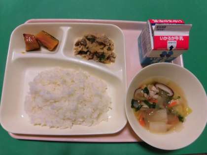 ★豚肉と干しずいきのみそ煮・すまし汁・焼きかぼちゃの甘みつかけ・ご飯・牛乳