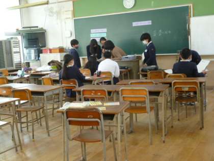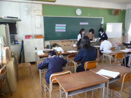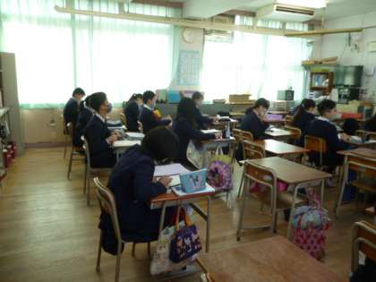 学級を二つのグループに分けて、算数の「まとめプリント」をしています。1問でも多く解きたいと、積極的に先生に質問していました。