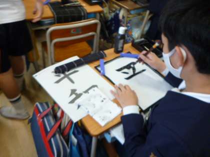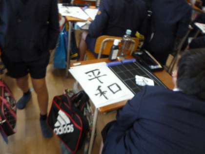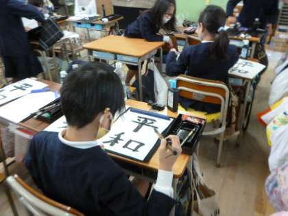今日は「平和」という字を書いています。しっかりと願いを込めてね。みんな上手に書くことができていました。