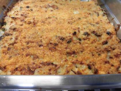 粉末チーズをかけて焼き上げます。表面はカリッとして、中はとろり。美味しかったです。ドリアなので、マカロニではなく米が入っています。