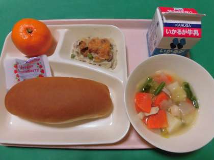 ★鶏肉とじゃがいものスープ煮・きのこのドリア・みかん・コッペパン・いちごジャム・牛乳
