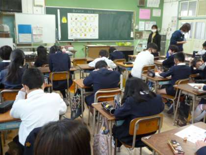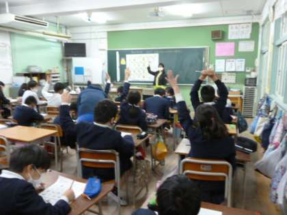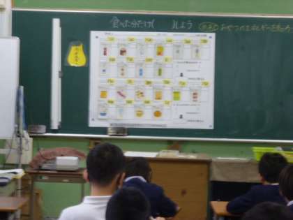 今日は栄養教諭の先生の授業です。「おやつのエネルギーを知ろう」ということで、自分たちの身近な問題であり、たくさん意見を発表していました。