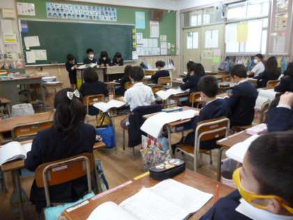 学習係の人が前にでてきて、宿題の答え合わせをしています。しっかりとできていたかな?