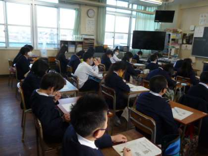 5年生も経年テストに向けて、今まで習ったところの復習プリントの問題を解いた後、解説を聞いています。