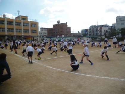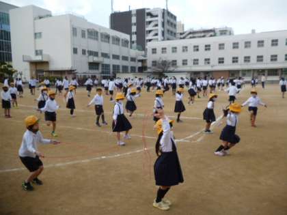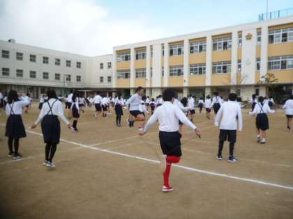 今日は1、4、6年生の耐寒運動(なわとび)の日です。みんなが外にでてきたタイミングで雪が降ってきて寒そうにしていましたが、活動が始まると元気になわとびを跳んでいました。