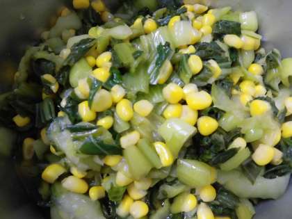「チンゲンサイとコーンの中華あえ」は、ゆでたチンゲンサイとコーンに、砂糖、米酢、うすくち しょうゆ、ごま油を合わせたタレをかけ、あえます。緑色と黄色の彩りのよい、あえものです。