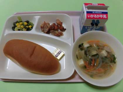 ★鶏肉のオイスターソース焼き・中華スープ・チンゲンサイとコーンの中華あえ・コッペパン・バター