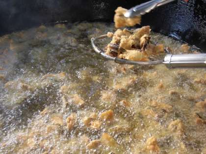 「さばのカレーたつたあげ」は、1人2切のさばをしょうが汁、料理酒、こいくちしょうゆ、カレー粉で下味をつけ、でん粉をまぶしてなたね油であげます 。