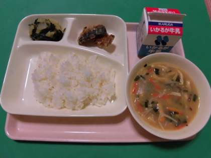 ★さばのカレーたつたあげ・さつまいもとうすあげのみそ汁・はくさいとほうれんそうの煮びたし・ご飯・牛乳