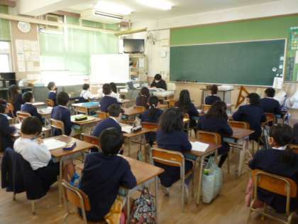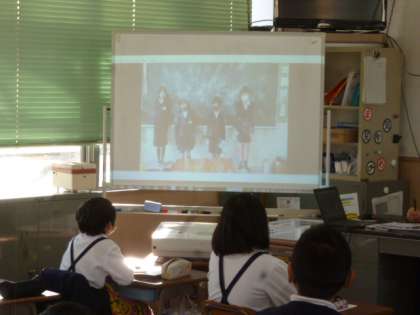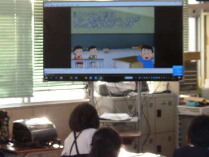 今日はあらかじめ録画した画像を教室のテレビやプロジェクターを使って行います。イントロクイズを集会委員会の人たちが考えてくれました。