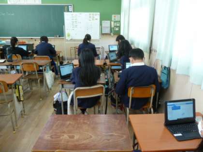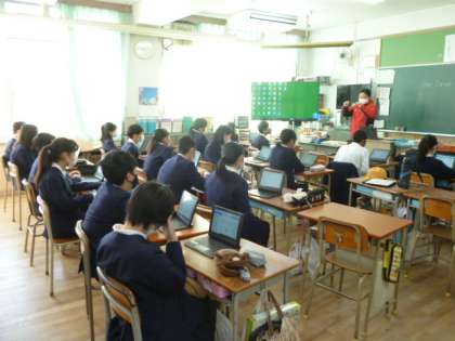 今日は先日配られたパソコンをつの使い方についての説明を聞いています。手つきがさまになっています。
