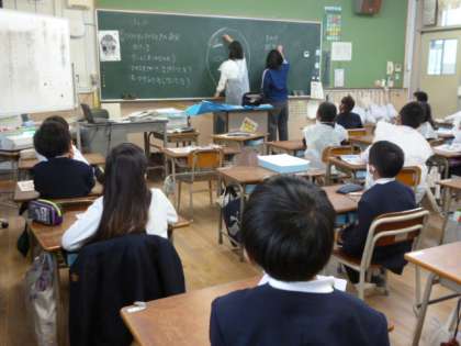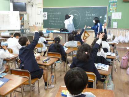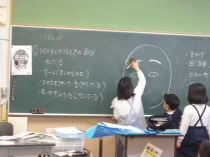 はんがを作るのに、まずは見本の顔の絵を黒板につくります。目や耳など顔のそれぞれの部分を分担して、見本を仕上げていました。どのようなはんがが、できるか楽しみです。
