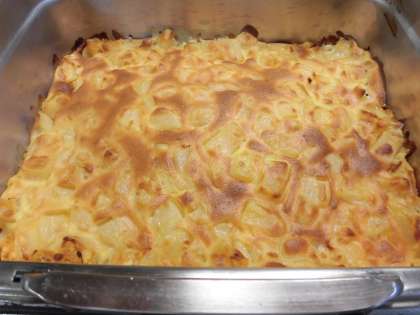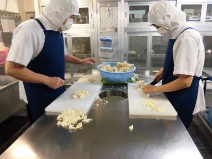 これに白桃(カット缶)を使った手作りのデザート「桃のクラフティ」を組み合わせています。生クリームもたっぷり入れた生地をバットに流し入れて焼き上げています。、子どもたちにも人気のデザートです。白桃は、山形県産の質の良いものを使っています。