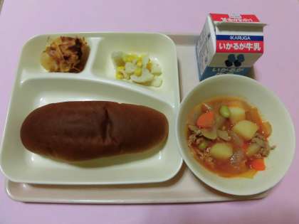 ★豚肉と野菜のケチャップ煮・カリフラワーのピクルス・桃のクラフティ・黒糖パン・牛乳