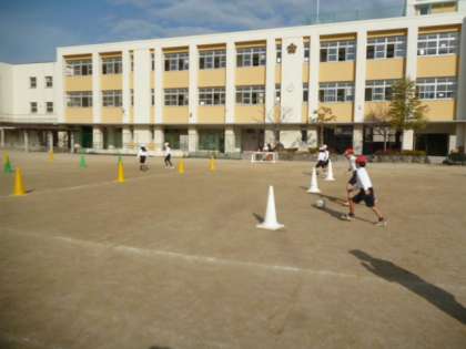 2組は運動場でサッカーの練習をしました。コーンのまわりをまわるドリブルも上手になってきました。