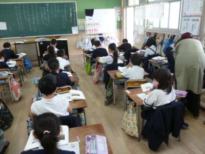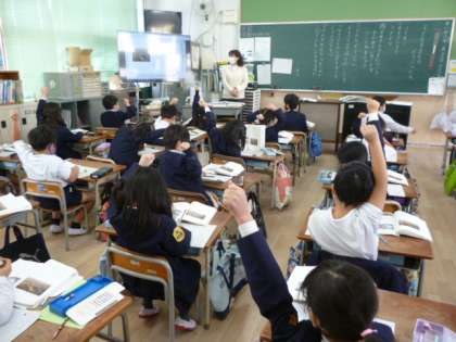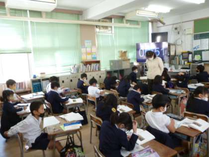 「子どもをまもるどうぶつたち」の学習です。オオアリクイについて書かれていることをたしかめながら、「どんなどうぶつか」「どんなちえをつかうか」など用意されたプリントに沿って、考えます。しっかりと考え、意見を発表していました。