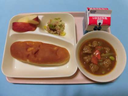 ★ミートボールと野菜のカレー煮・ツナとキャベツのソテー・りんご・おさつパン・牛乳