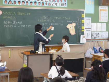 「大きくなった自分のことをまとめよう」「小さなころにつかっていたものをしょうかいしよう」ということで、小さい時に使っていたものや写真を持ってきてくれました。とても小さなくつしたを見て「ちっちゃ!」と小さい時のことを思い出していました。いろいろなものを順番に発表してくれました。