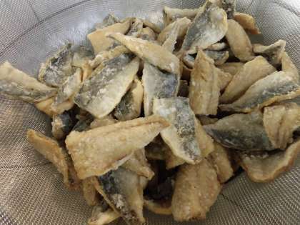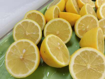 「アジのレモンマリネ」は、年1回使用のアジをなたね油であげ、いためたたまねぎとレモン汁などで作ったマリネ液をからませます。レモン汁は、最後に加えることで風味を残すようにしています。給食では、国産のレモンを使用しています。小・中合わせて21個たっぷり使っています。