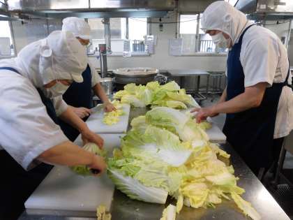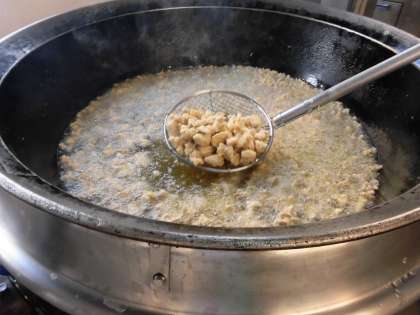 「鶏肉のからあげ」は、鶏肉(もも皮無大) に、しょうが汁、みじん切りのにんにくなどで下味をつけ、でん粉をまぶし、風味よくあげます。子どもたちも先週から「月曜日は、から揚げやなぁ。」と楽しみにしていました。