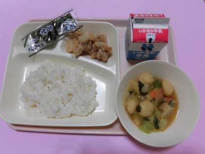 ★鶏肉のからあげ・まる天と野菜のうま煮・焼きのり・ご飯・牛乳