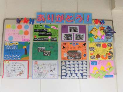 先週の給食週間に、各クラスで感謝をこめて作成し、給食調理員さんにお渡しした来年度4月からのカレンダーが勢ぞろいしました。どれも、楽しく表現してくれていますね。