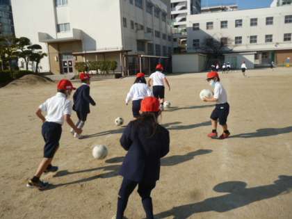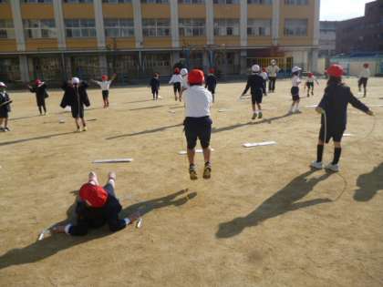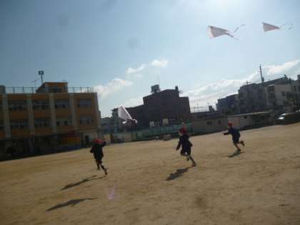 サッカーのドリブル練習をした後に、なわとびをしました。さらにその後には自分たちで絵を描いた凧揚げをしました。勢いよく走ることにより、凧をしっかりと揚げることができました!