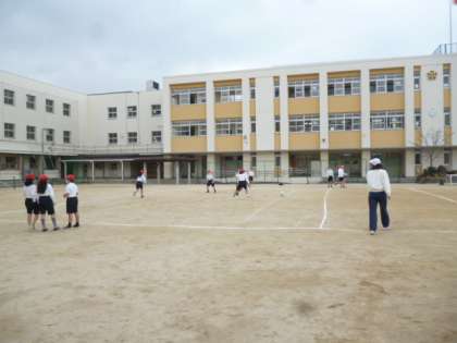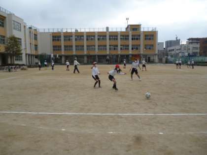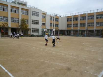 2組は運動場でサッカーの練習をしています。2人組でパスをしながら、守備をかわしてシュートをします。守備にボールを触れられると交代です。シュートできるかな?